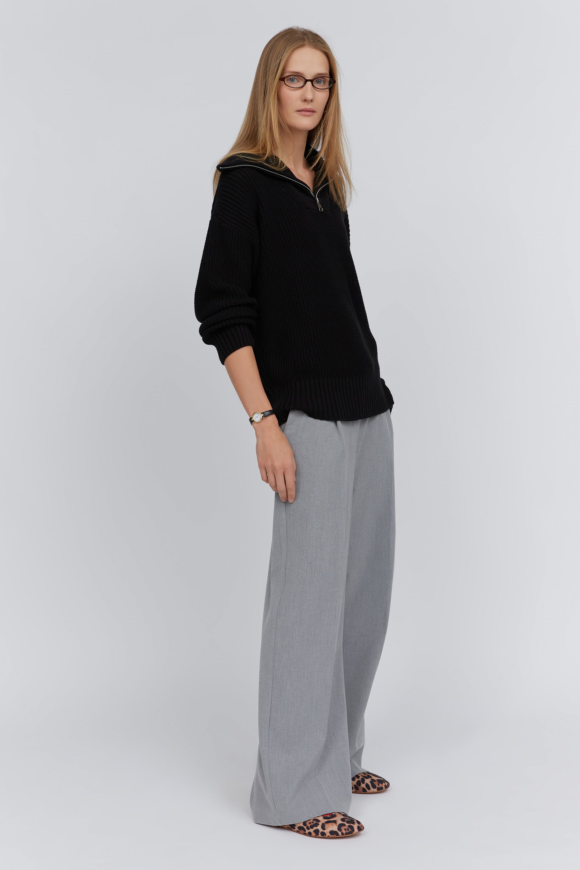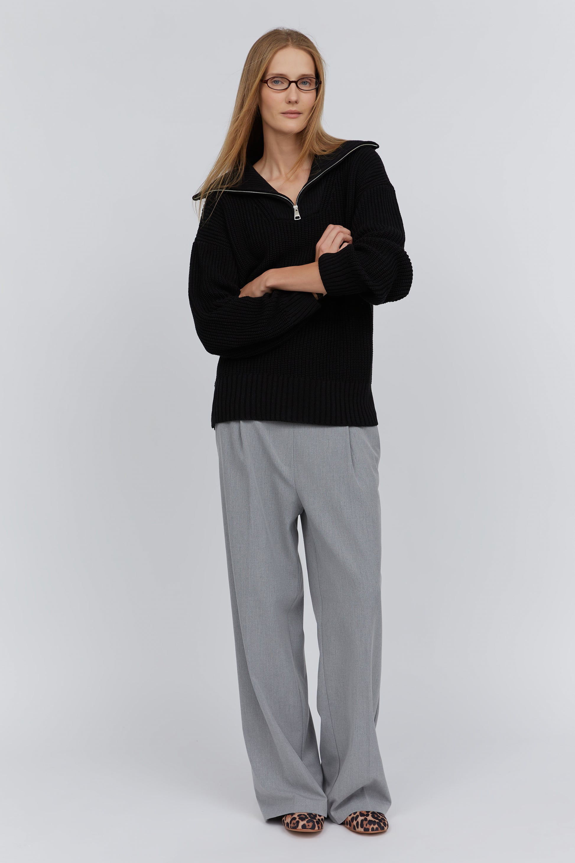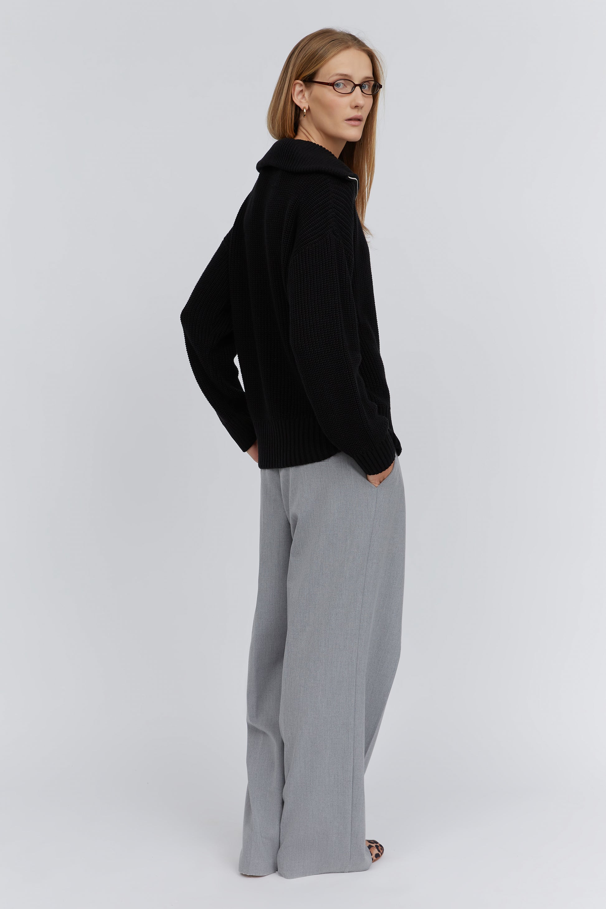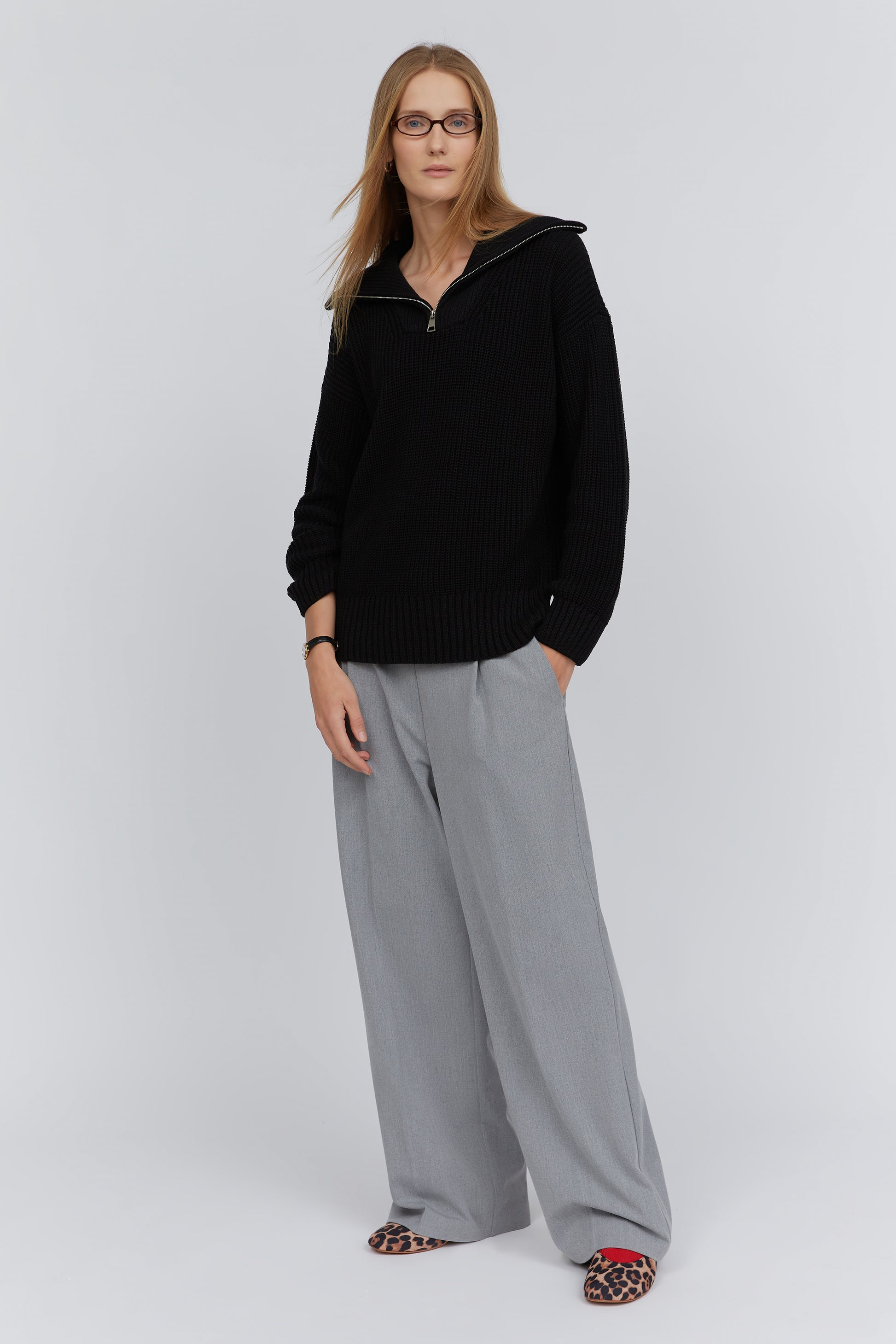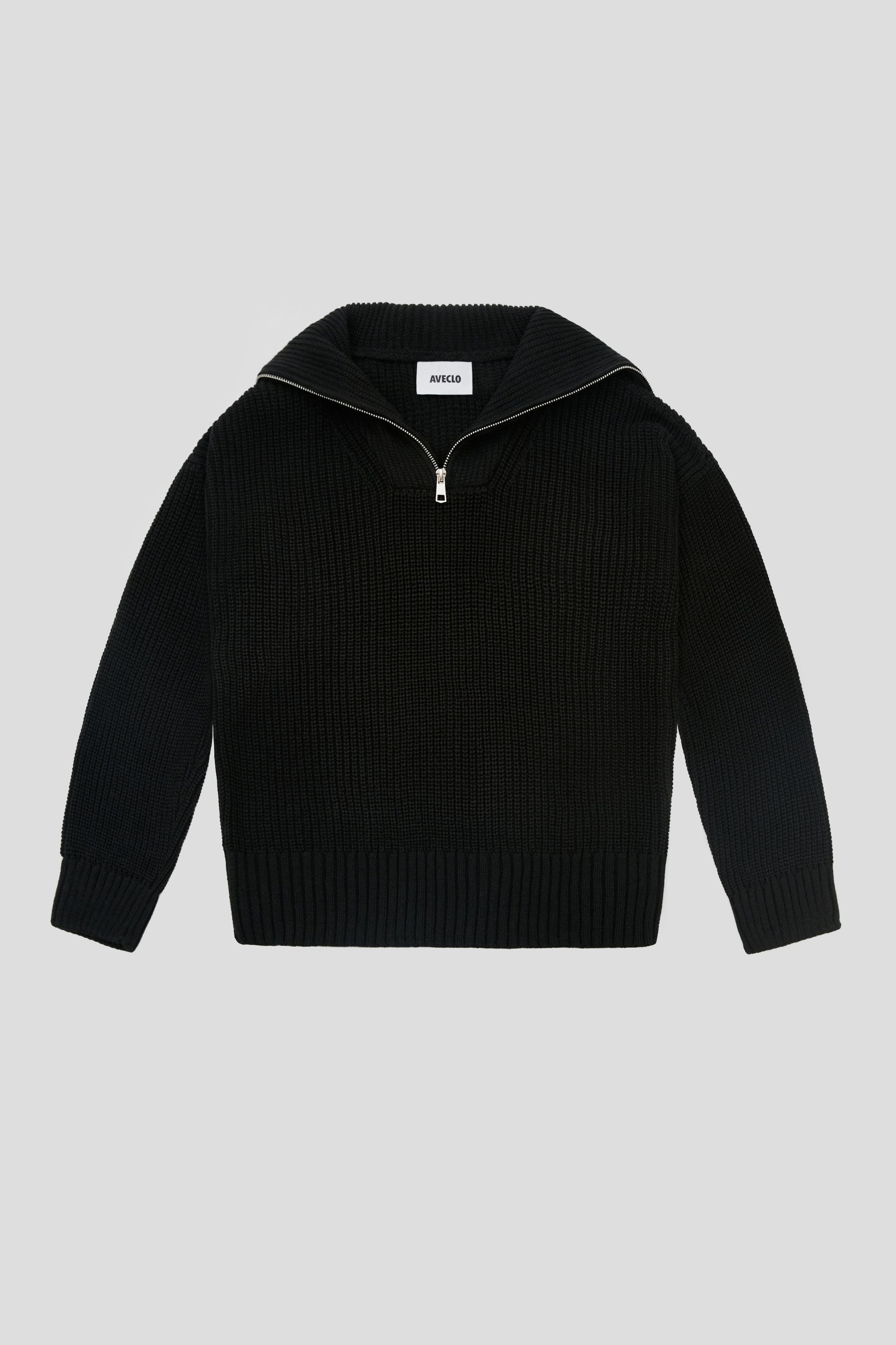 This black sweater with a zipper collar combines minimalism with functionality. The black shade adds a sleek, refined look, while the zipper allows you to adjust the collar to your preference—wear it raised for warmth or open for a more laid-back vibe. With a relaxed fit, this one-size sweater ensures comfort and effortless style.
