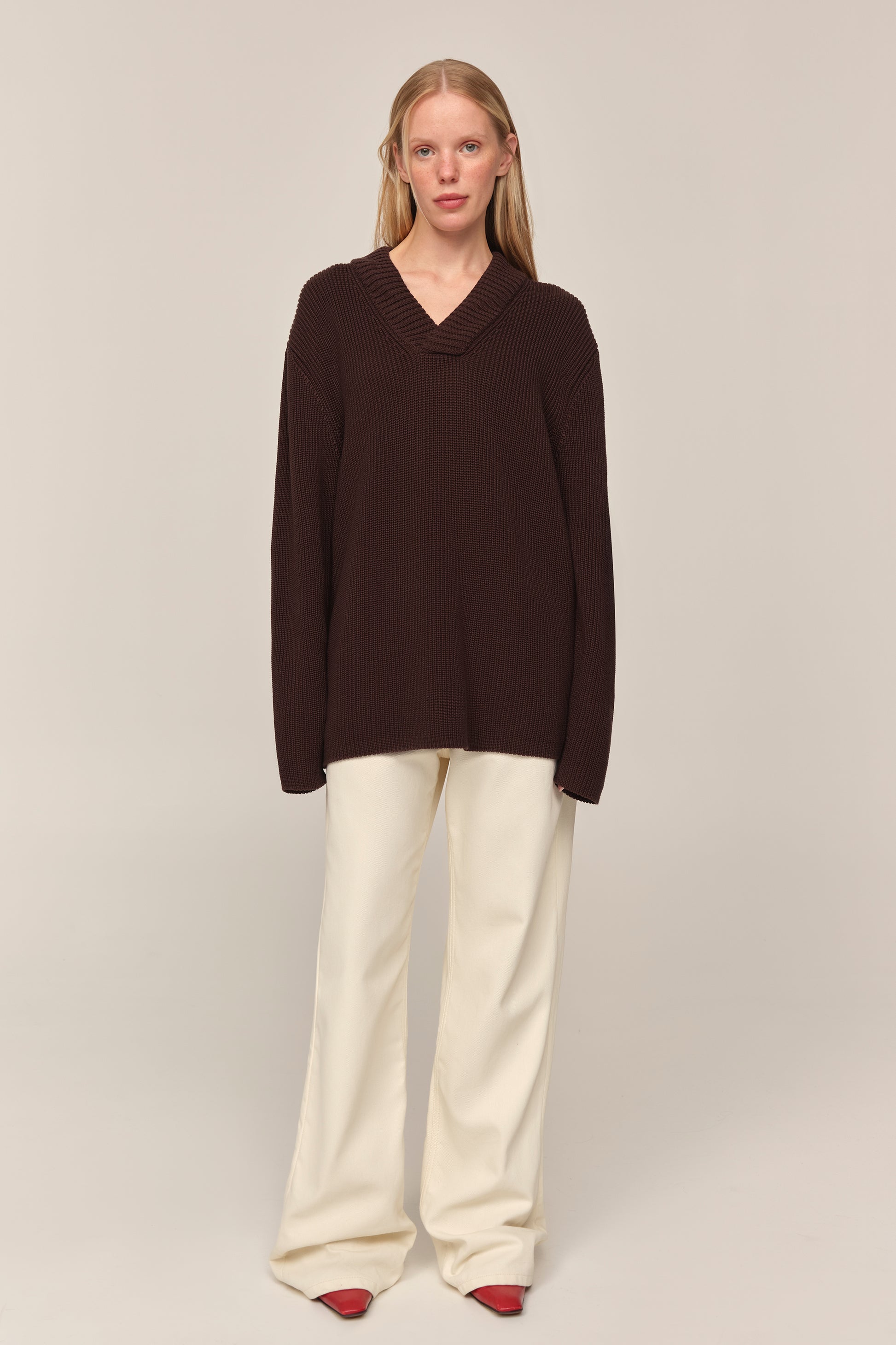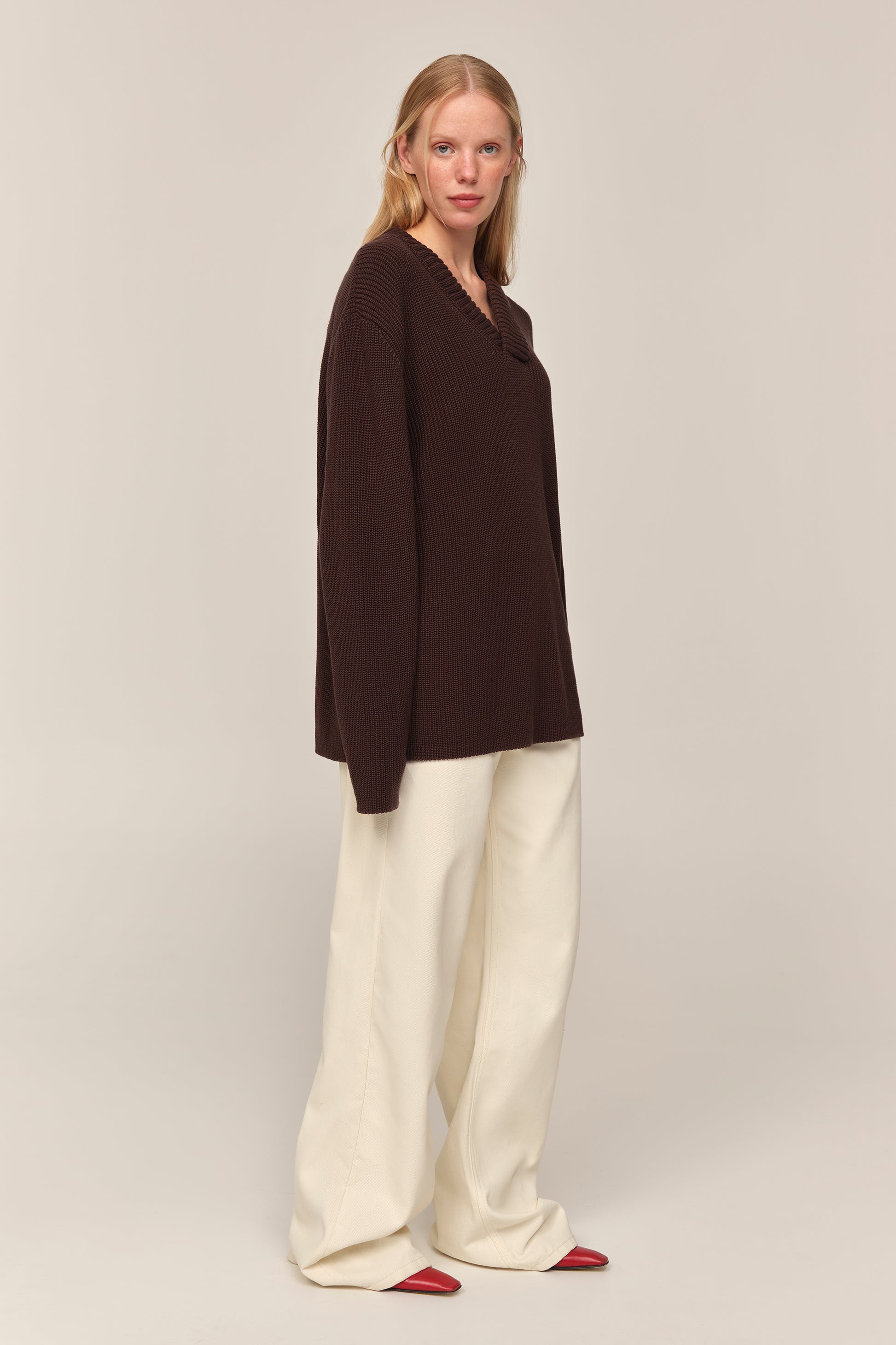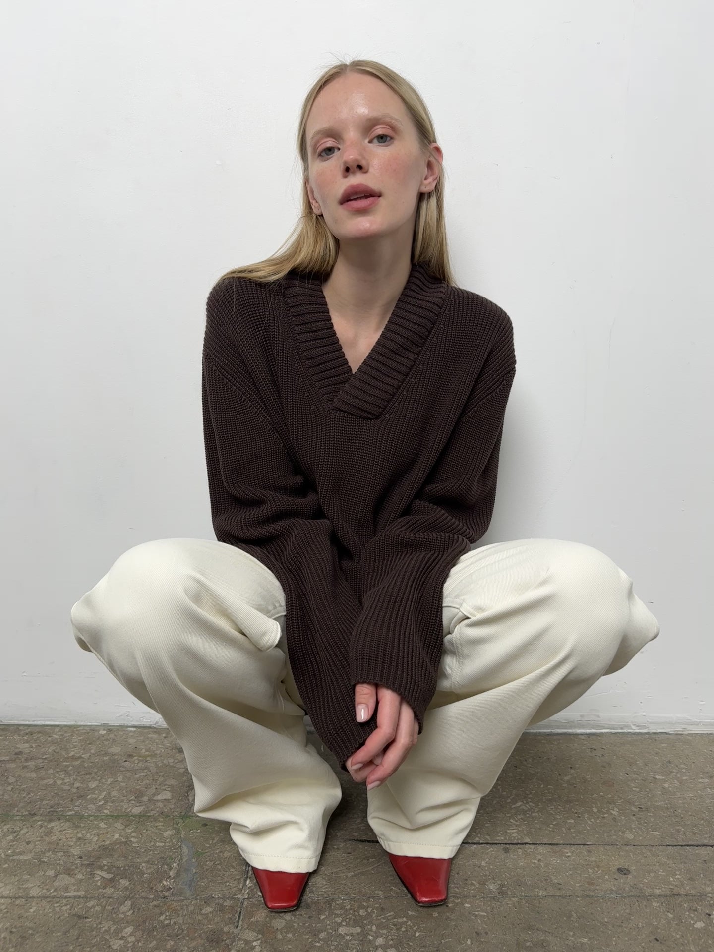 In creating the Selina sweater, we worked intentionally with proportions: the body was lengthened to give the silhouette a more grounded and confident line, while the depth of the neckline was kept measured to preserve balance. The collar frames the neckline with subtle clarity, adding a composed edge.