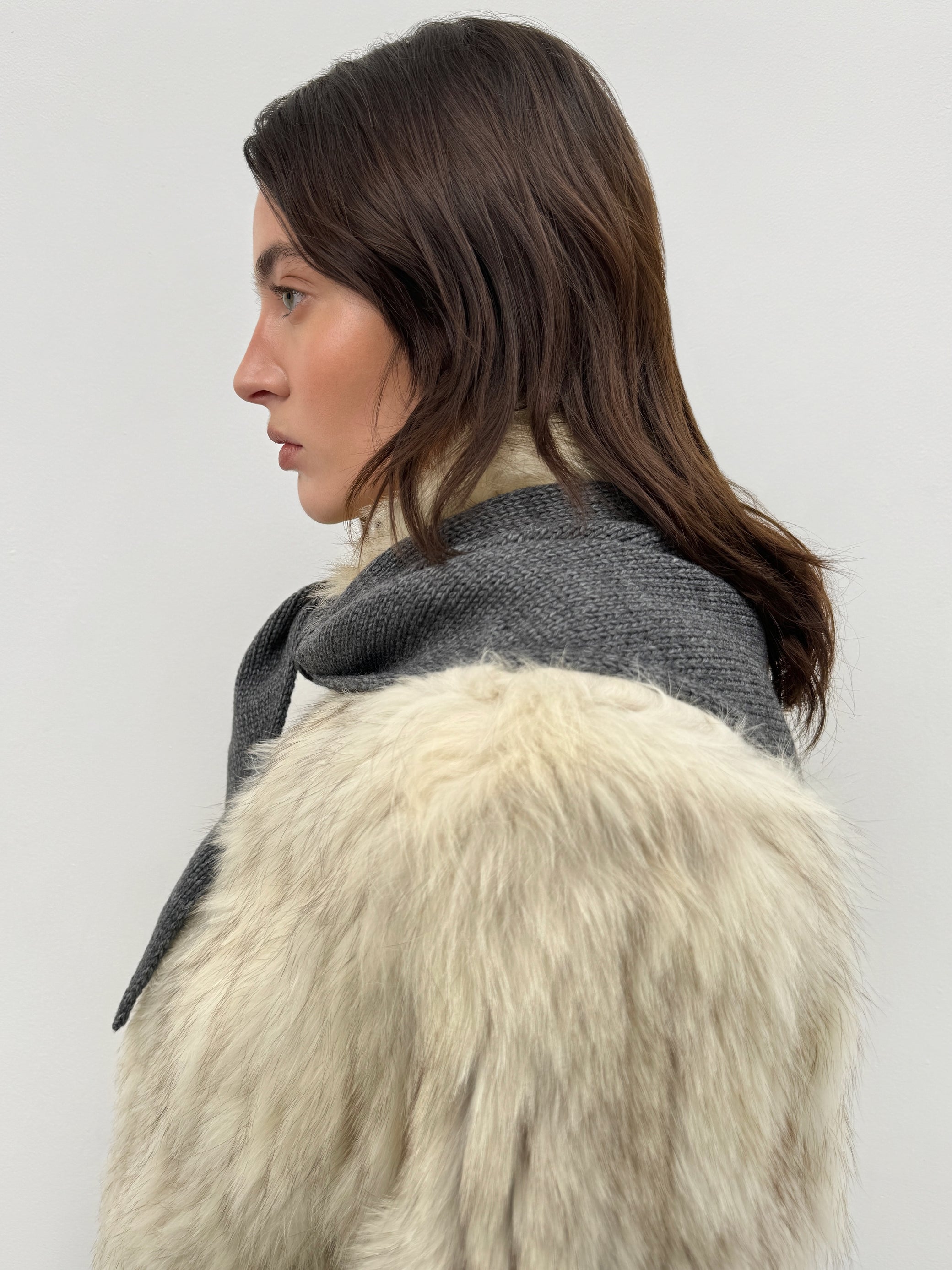 A knitted merino triangle scarf with a soft, balanced feel. It drapes with ease, with elongated ends that create a clean, versatile silhouette. Light, warm, and understated — a quiet finishing touch for coats, shearling, and minimalist looks.