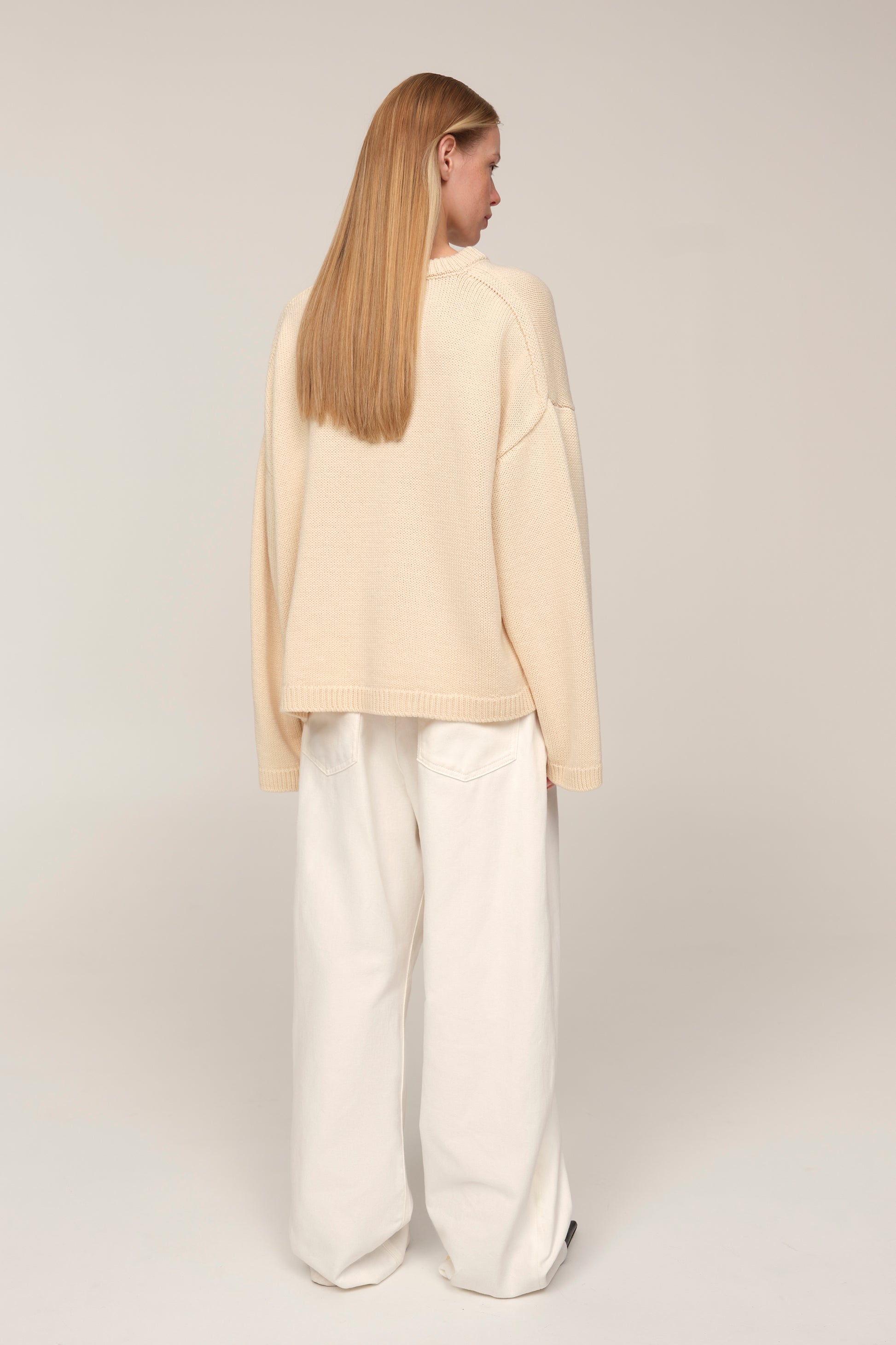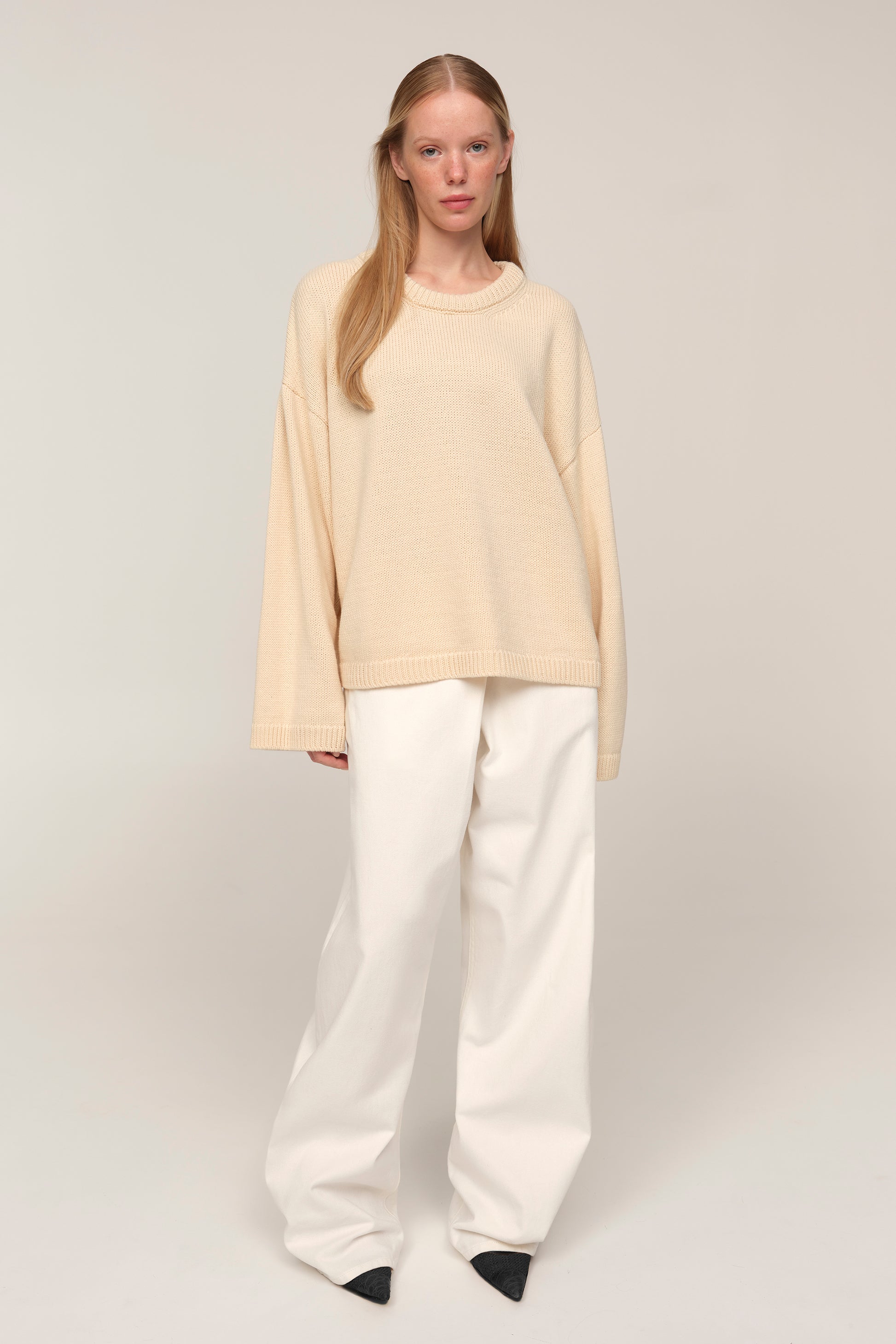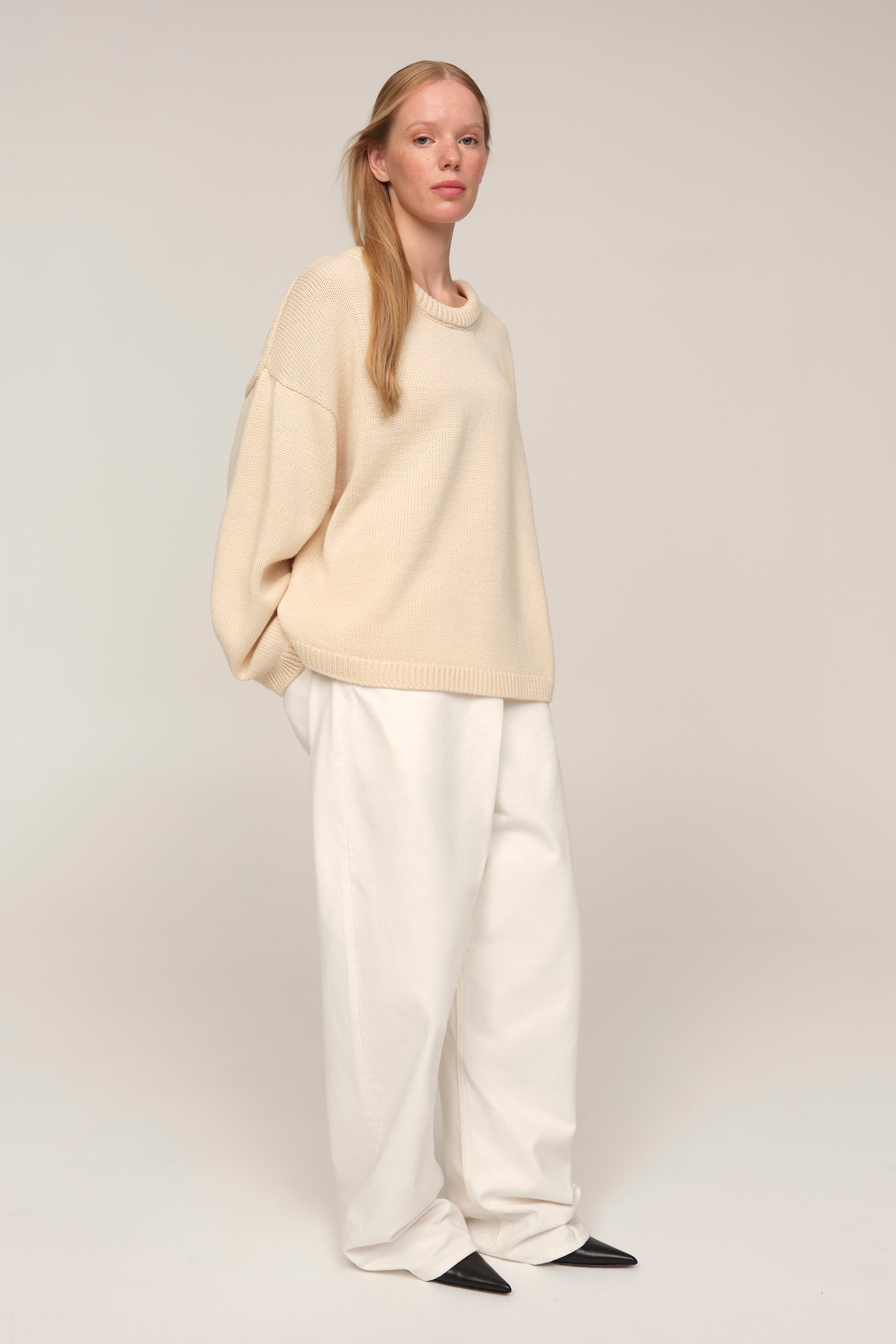Elva is a sweater that balances freedom with graphic clarity. Its cropped length offsets the wide sleeves and dropped shoulder, creating a modern silhouette with a touch of light architecture. Merino wool brings a harmony of warmth and lightness, turning Elva into a piece that feels equally right in simple pairings with denim and in more considered stylings.
