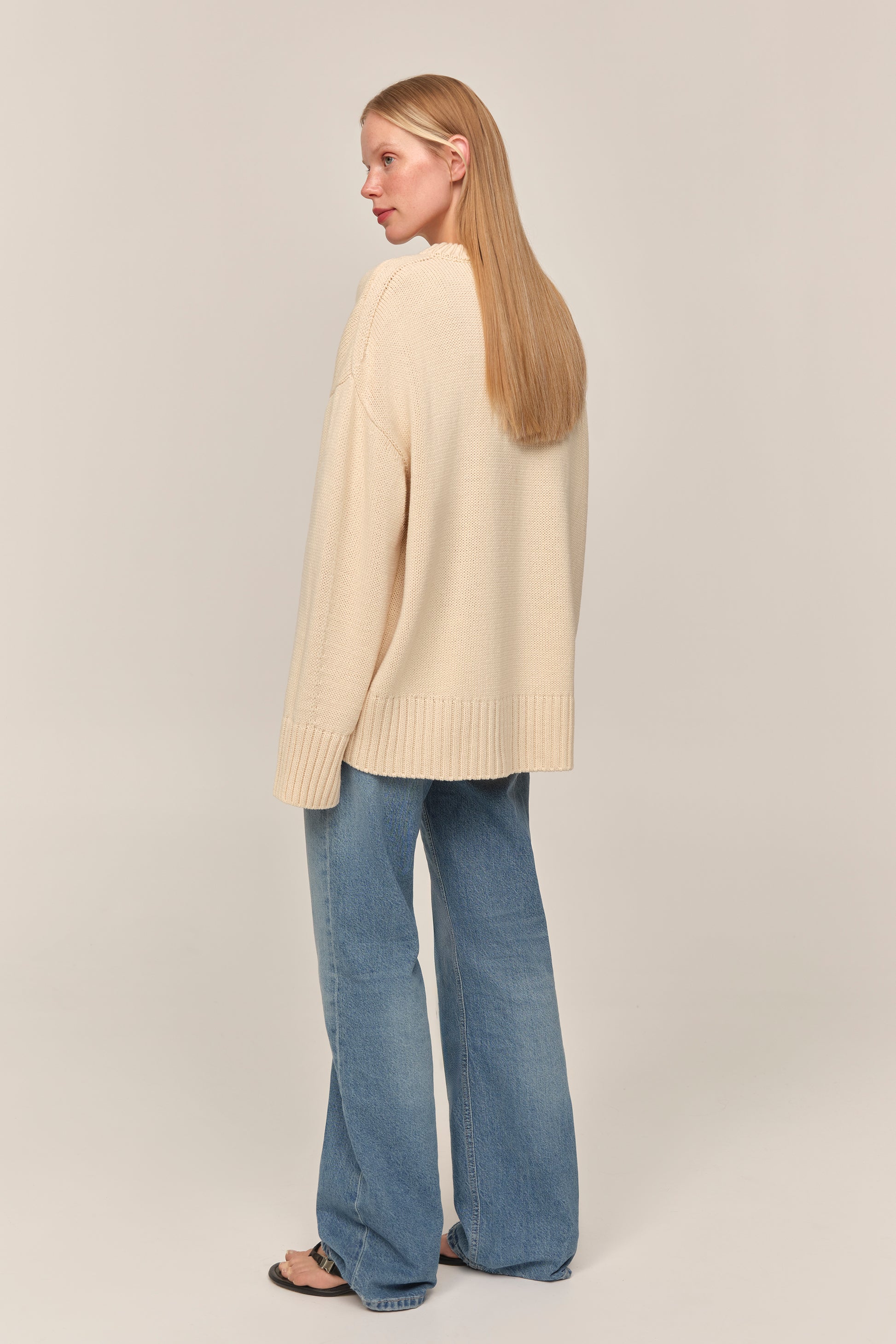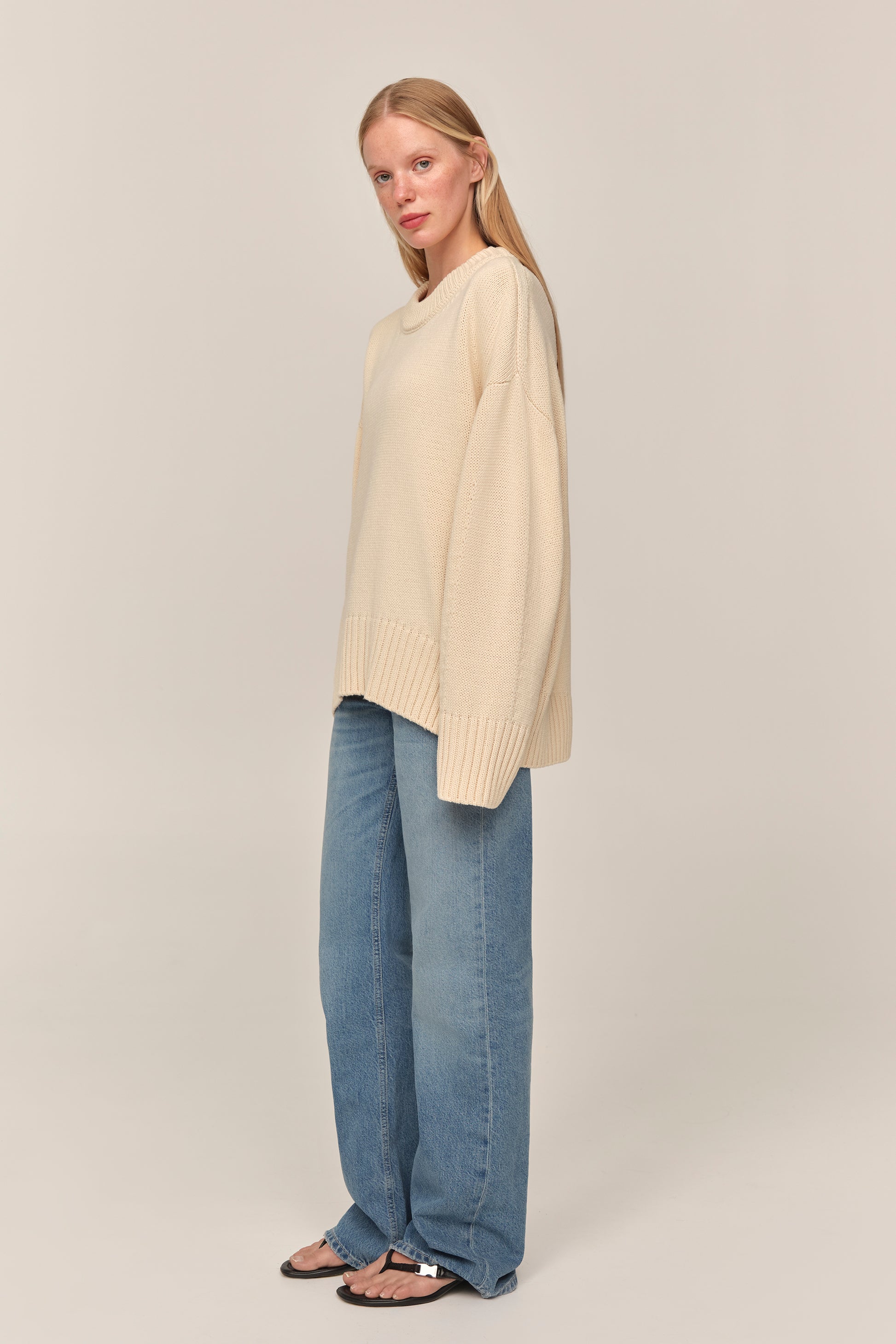 Sena is knitwear in its purest form. A voluminous silhouette, soft weave, and distinctive texture make it a piece that shapes the look on its own. The subtle asymmetry between front and back lends the silhouette definition and underscores the intention behind its design. Elongated sleeves add a sense of ease, while the merino wool makes it feel especially natural — warm without unnecessary weight. This is not a random “basic” but the sweater that anchors a wardrobe: restrained at first glance, yet with a character that unfolds in every combination.