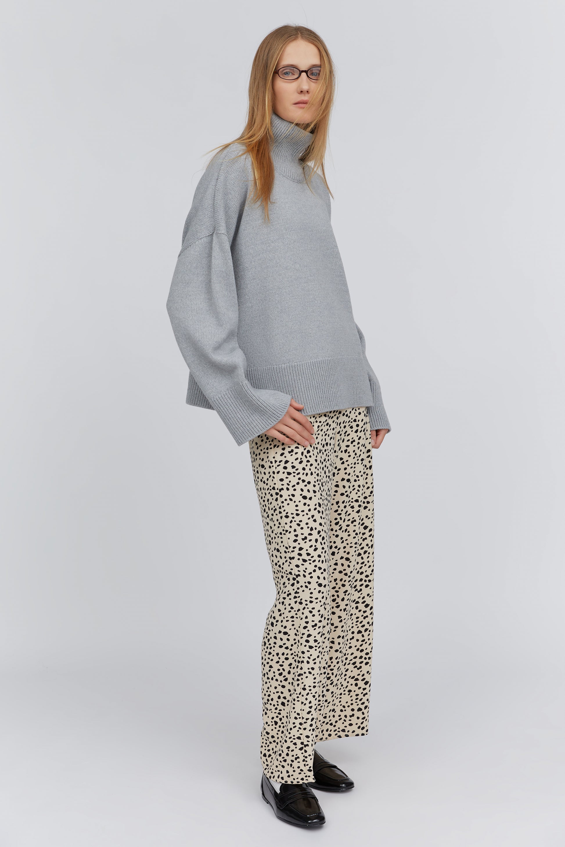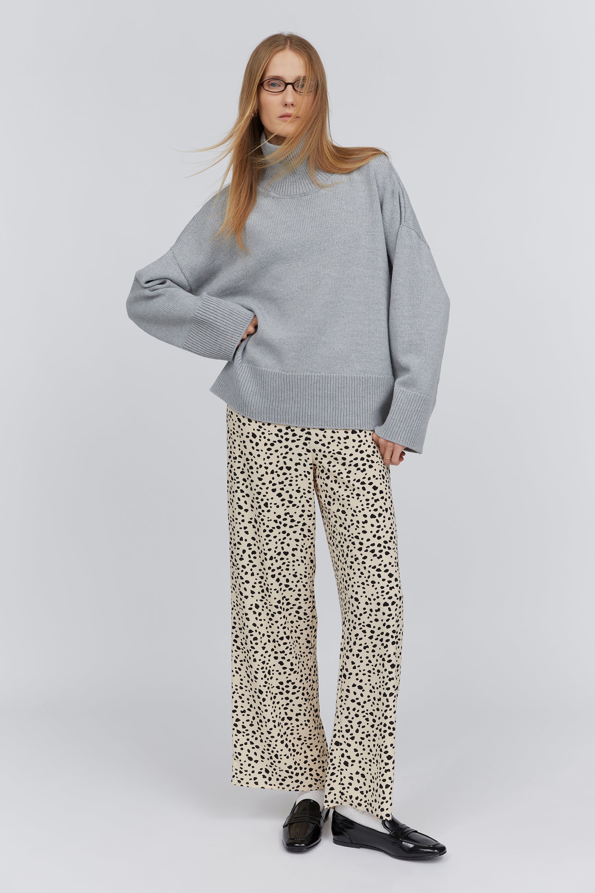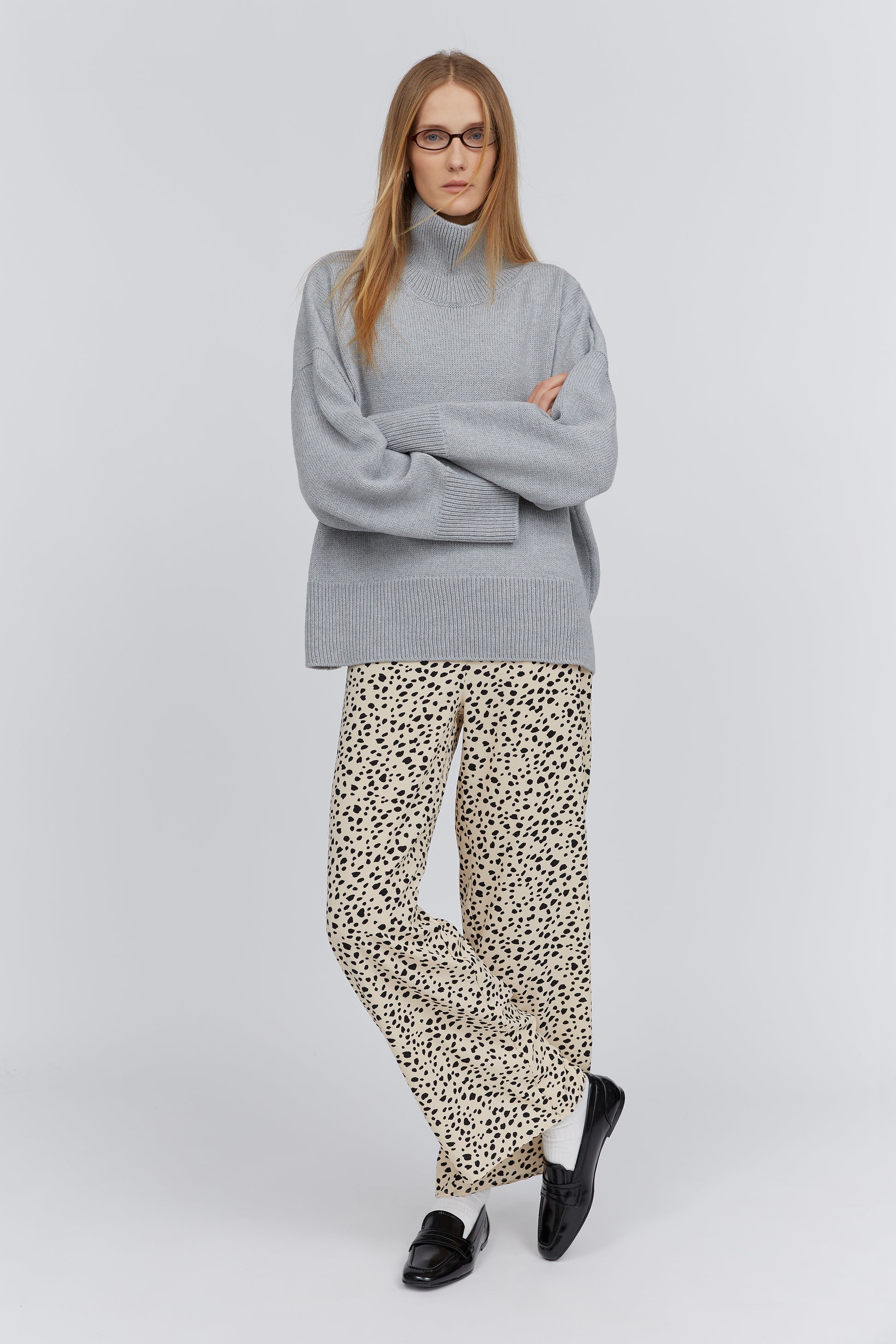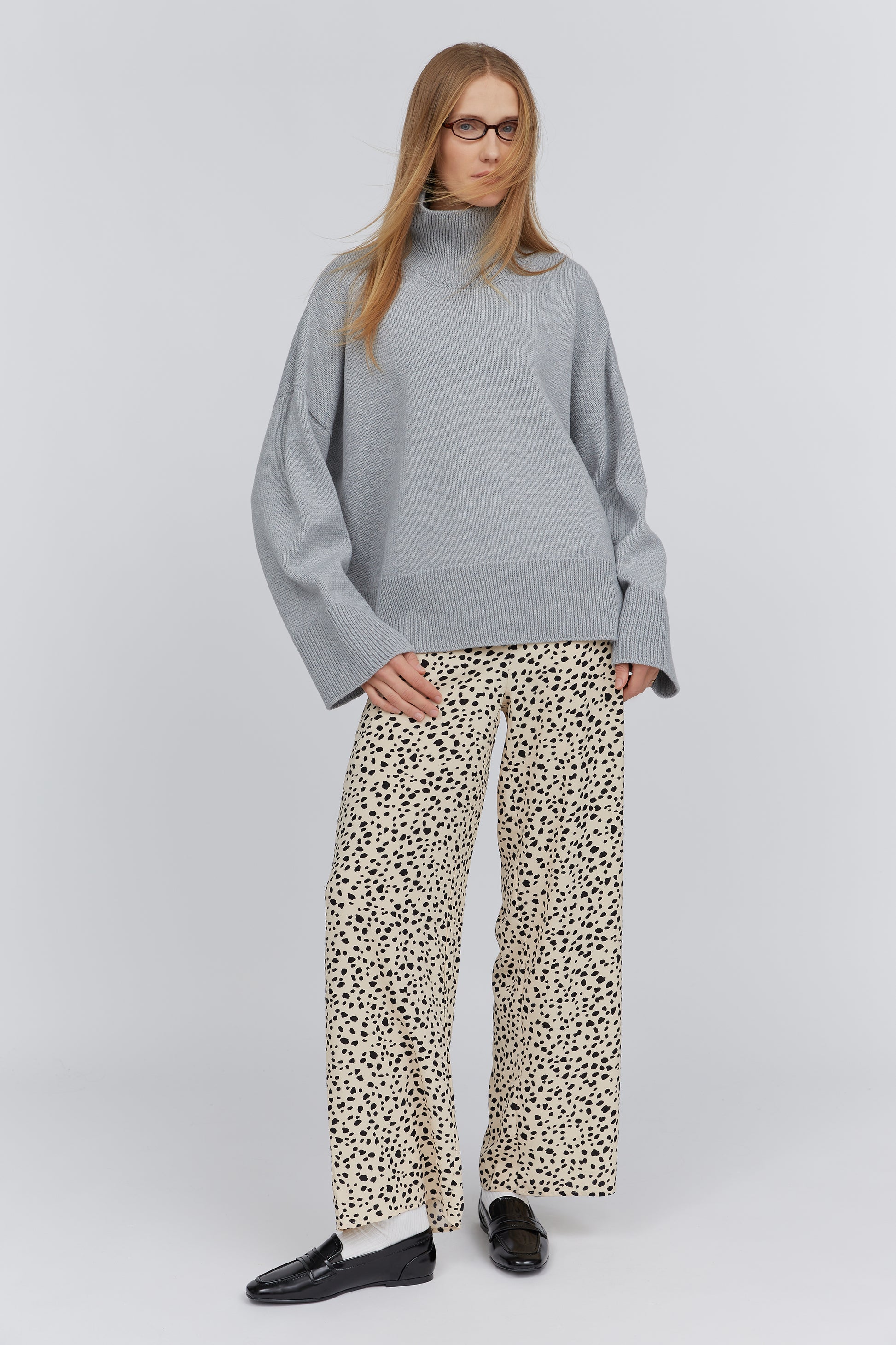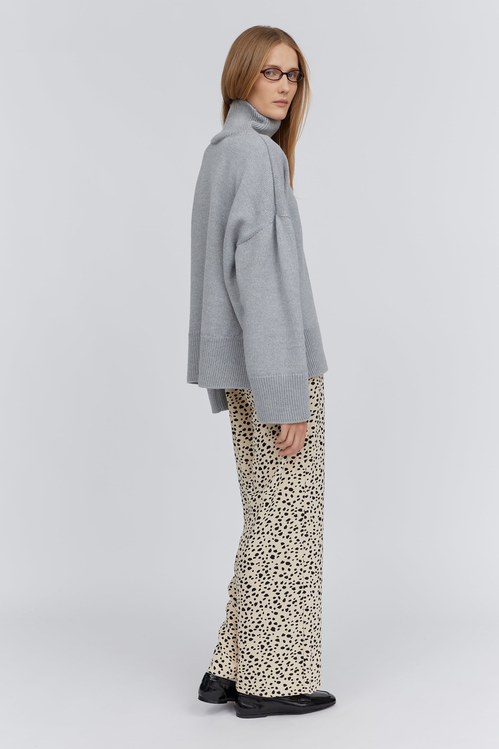 This gray merino wool sweater with a high collar is perfect for adding a touch of cozy sophistication to your look. Its soft, neutral tone blends easily with other colors, making it a versatile choice for endless styling possibilities. The relaxed fit enhances comfort, allowing you to look effortlessly stylish. At Aveclo, we call it the forever sweater.