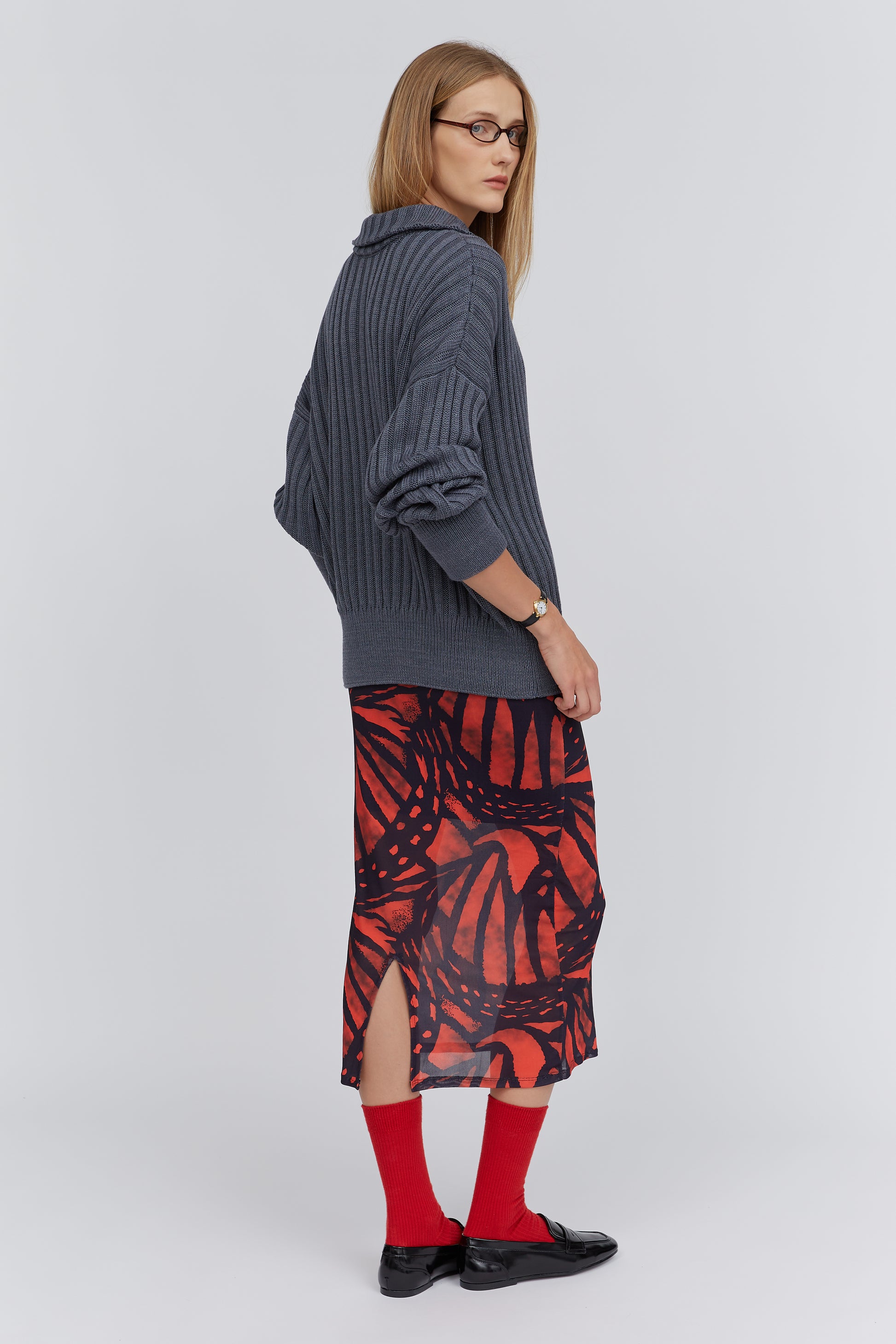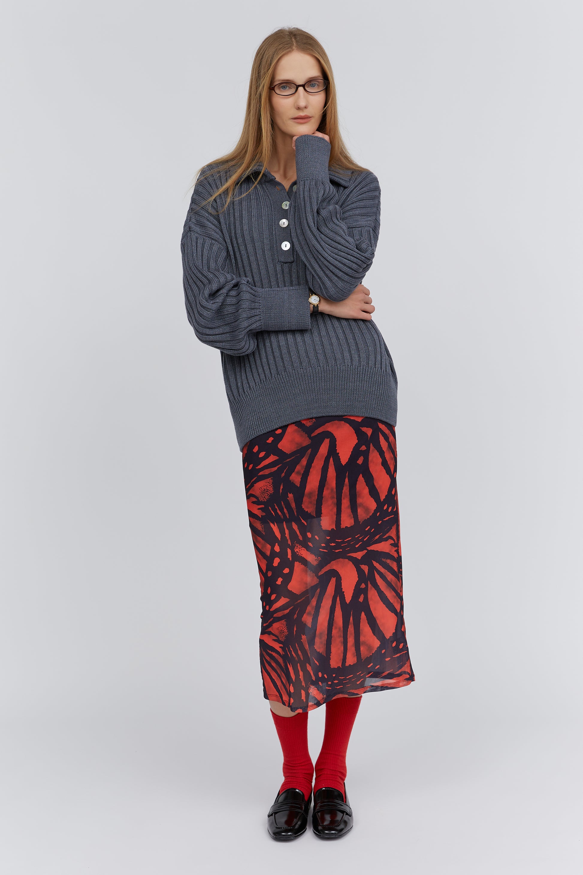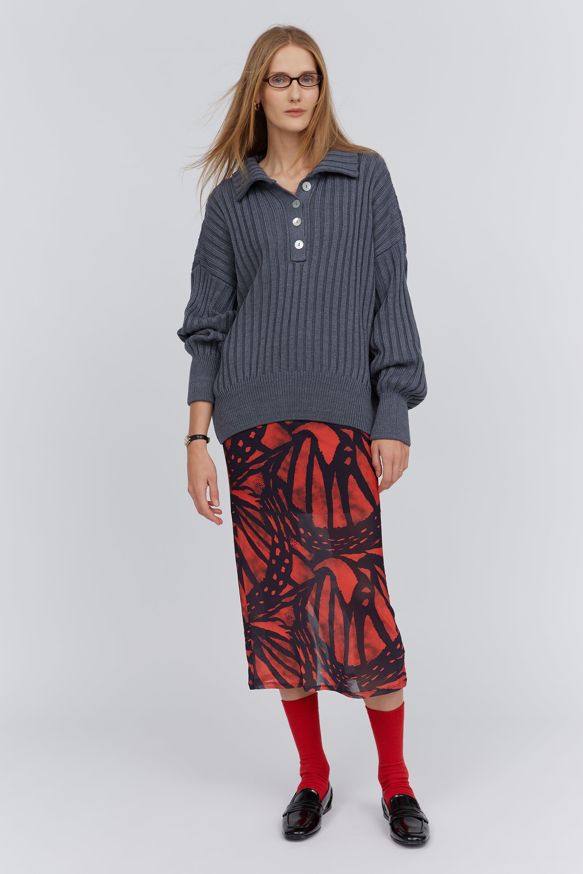 The classic gray polo sweater with mother-of-pearl buttons is a versatile addition to any wardrobe. The buttons add a stylish accent, looking great in photos, while the raised collar provides both warmth and a chic look. The relaxed fit ensures comfort and a polished appearance.