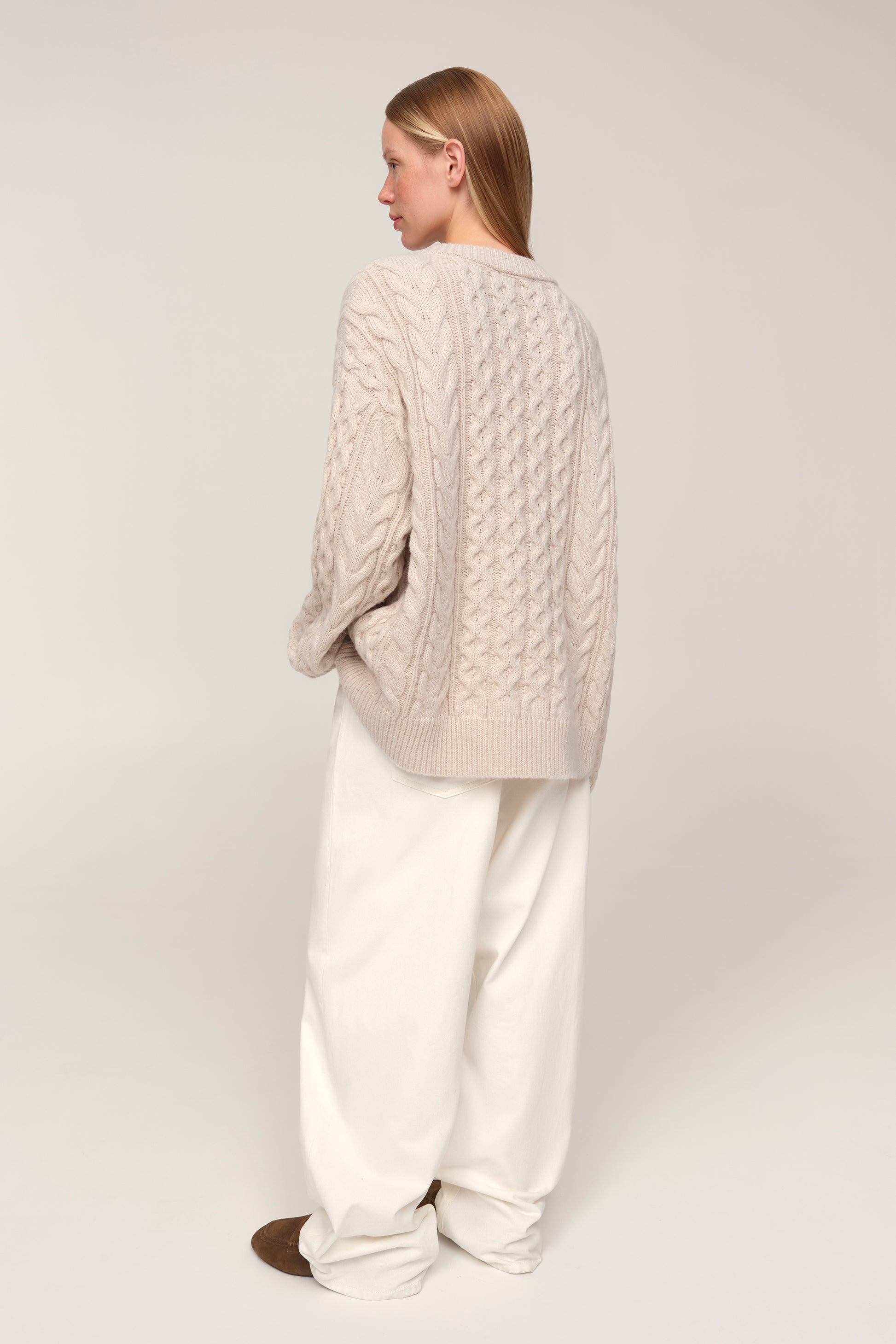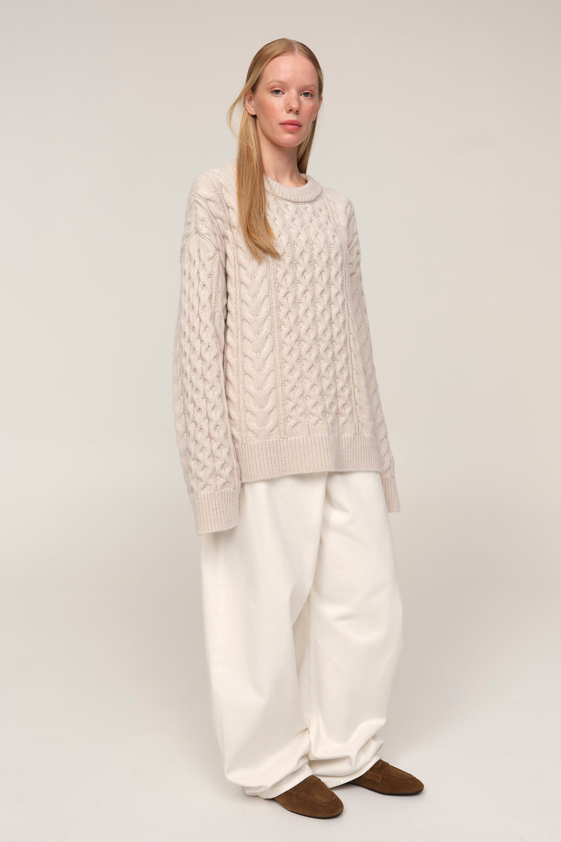 The Avena sweater was designed as a refined expression of comfort. The cable-knit pattern holds a timeless quality, echoing the classical heritage of knitwear while retaining a soft, modern sensibility. With long sleeves and a silhouette marked by volume, it becomes effortless in everyday wear — understated, yet never ordinary. A key piece in any wardrobe, it moves seamlessly from simple pairings to more considered styling.