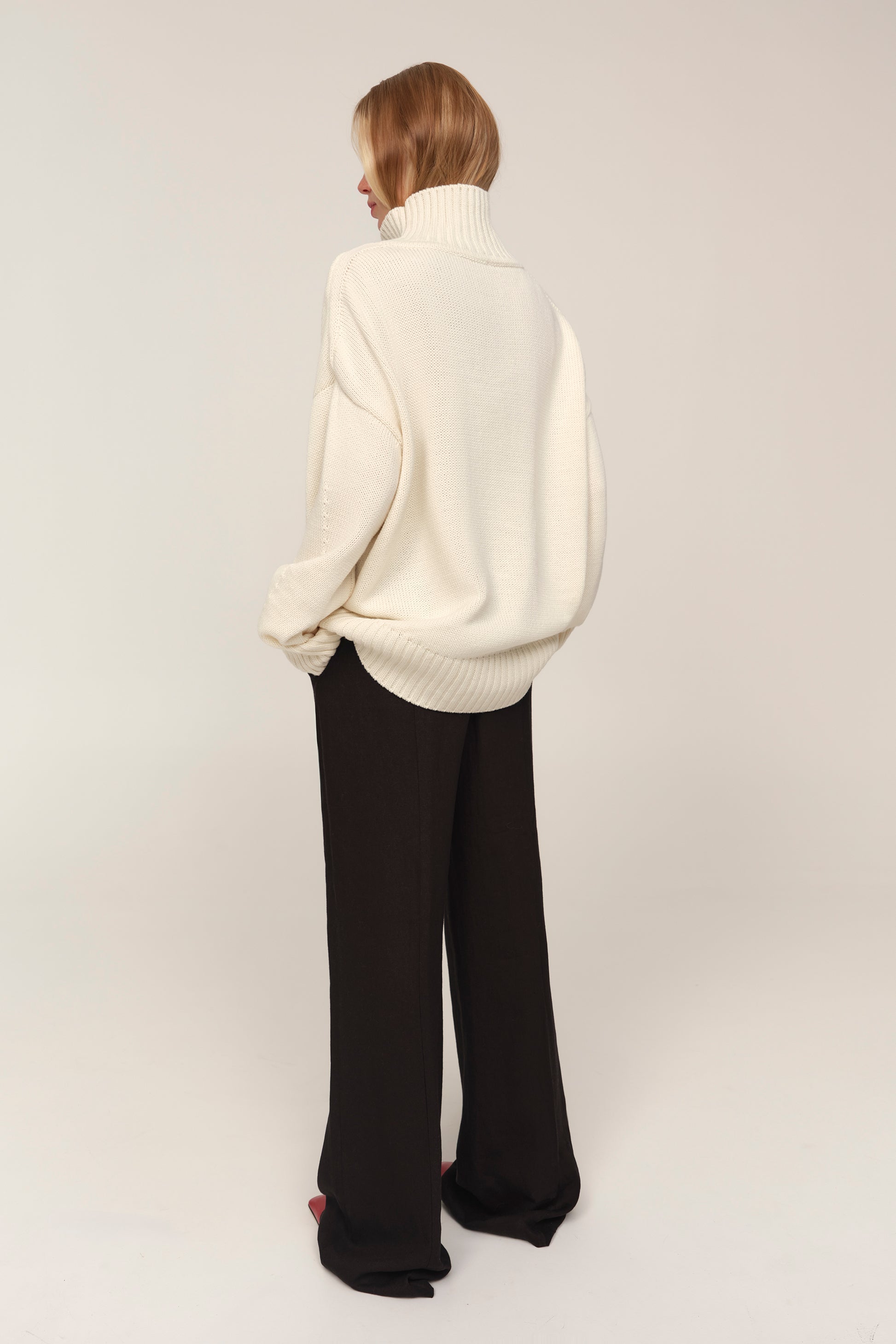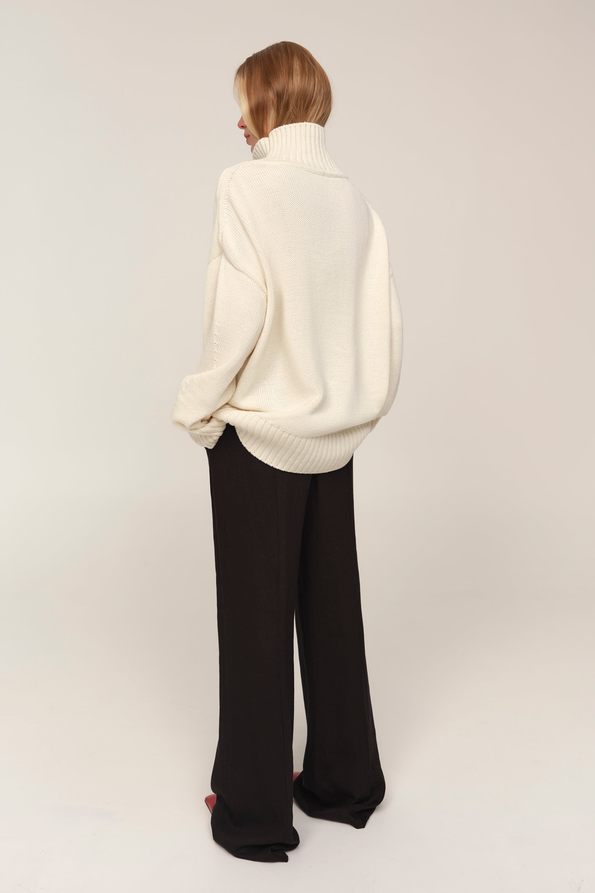 Shown here in size M/L — recommended if you wish to emphasize the sweater’s generous volume.