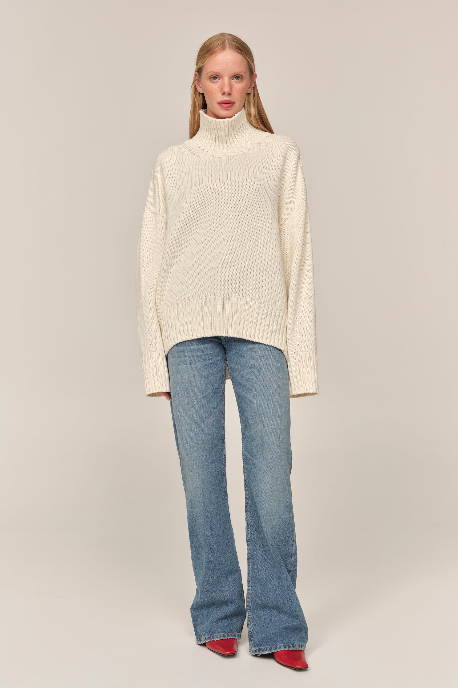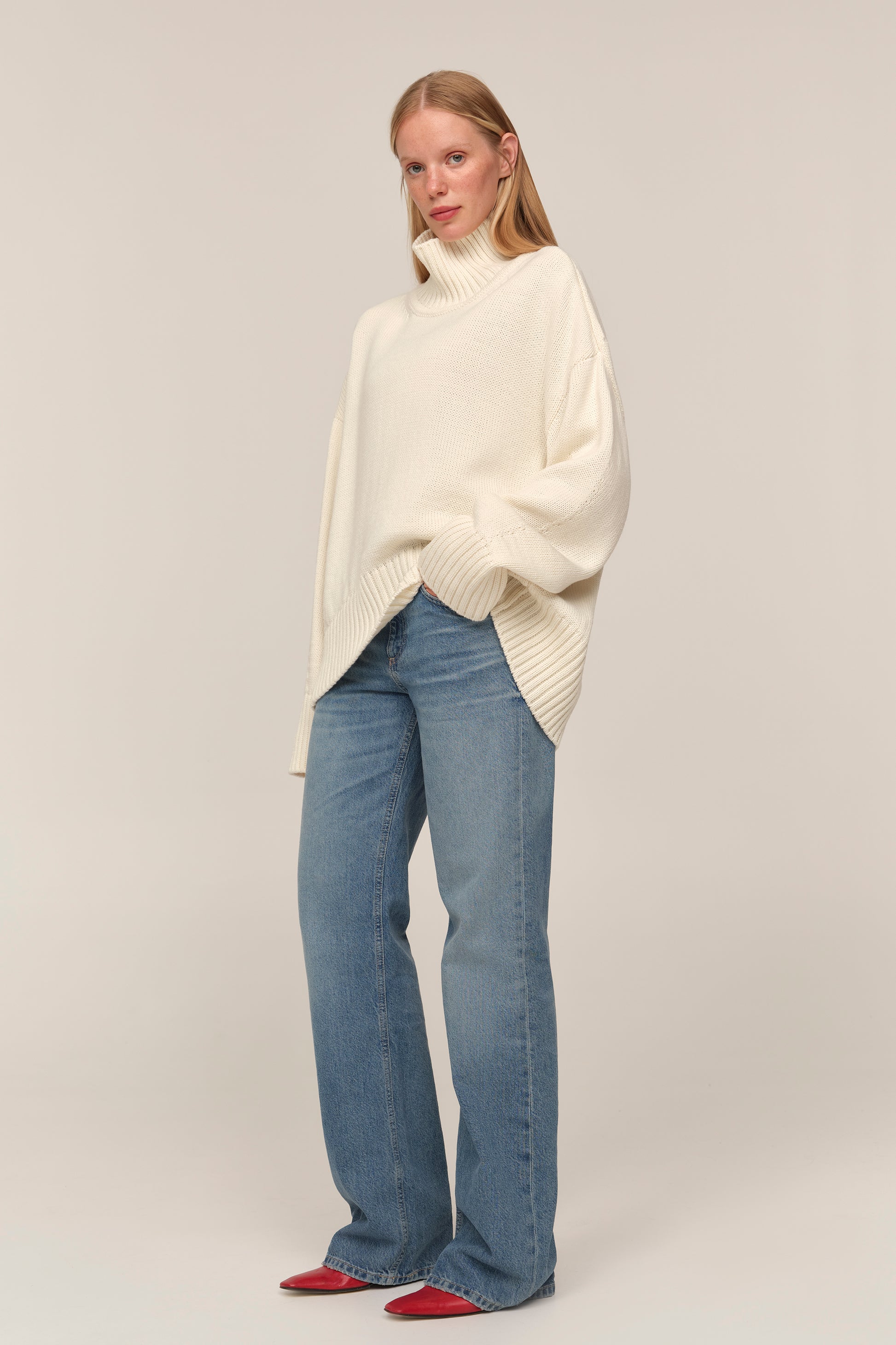 The Isla sweater was created as a piece of modern classic, balancing comfort with a bold sense of form. Its silhouette carries a deliberate volume, while the subtle difference in front and back length adds a touch of structure and movement. Extended sleeves bring an air of coziness, and the soft texture underscores an effortless feel. This is a foundational wardrobe piece — natural in everyday pairings, yet striking in more considered stylings.
