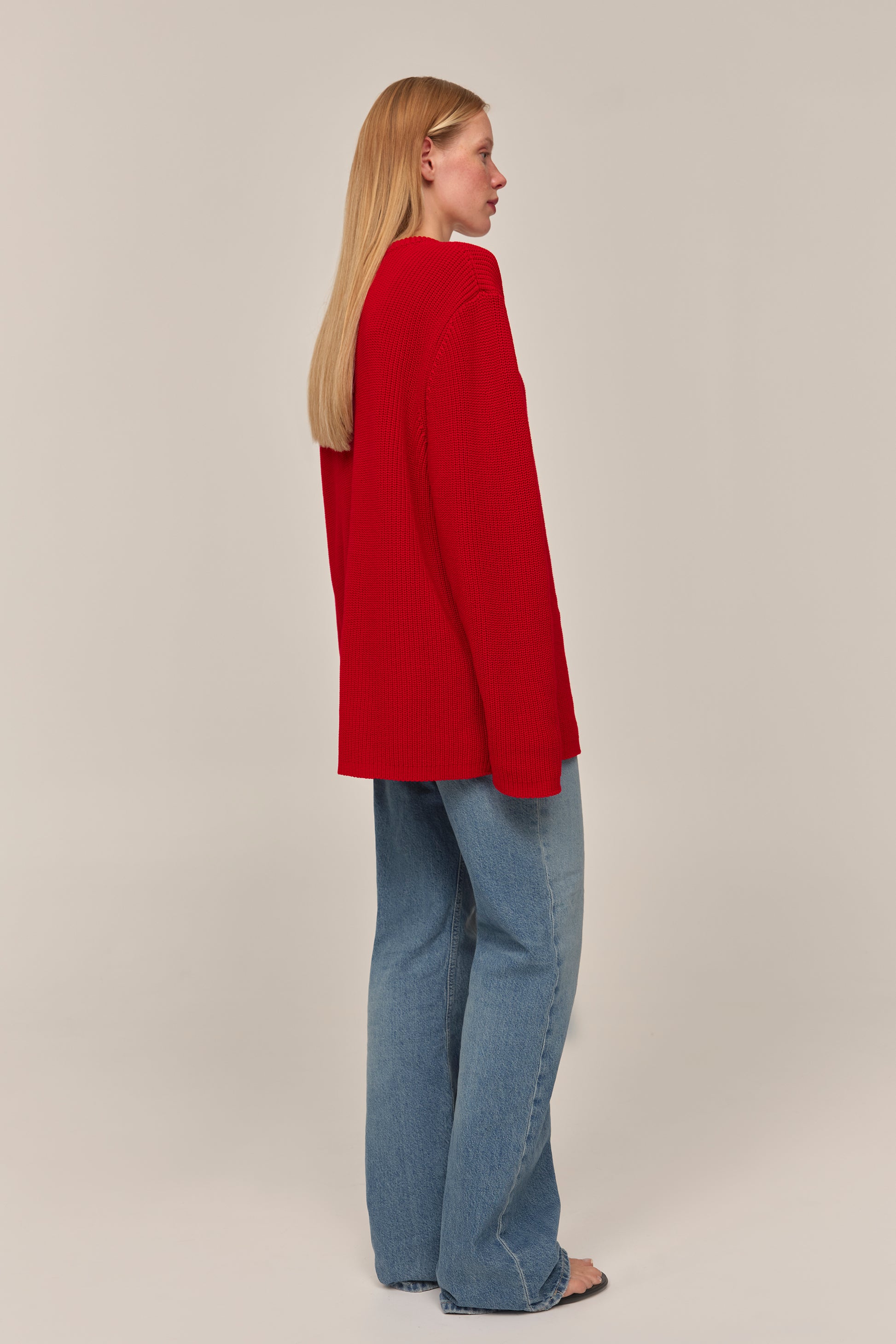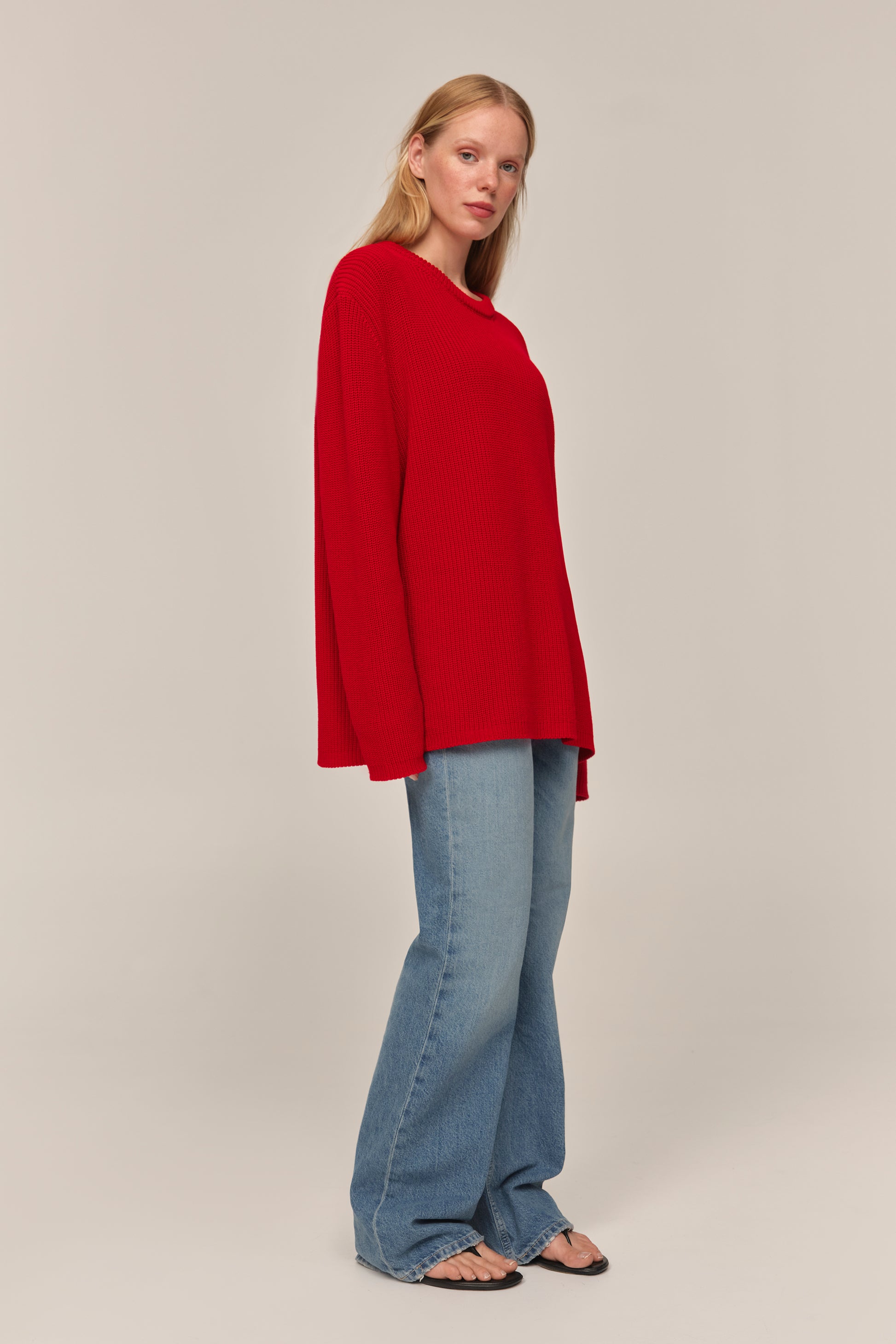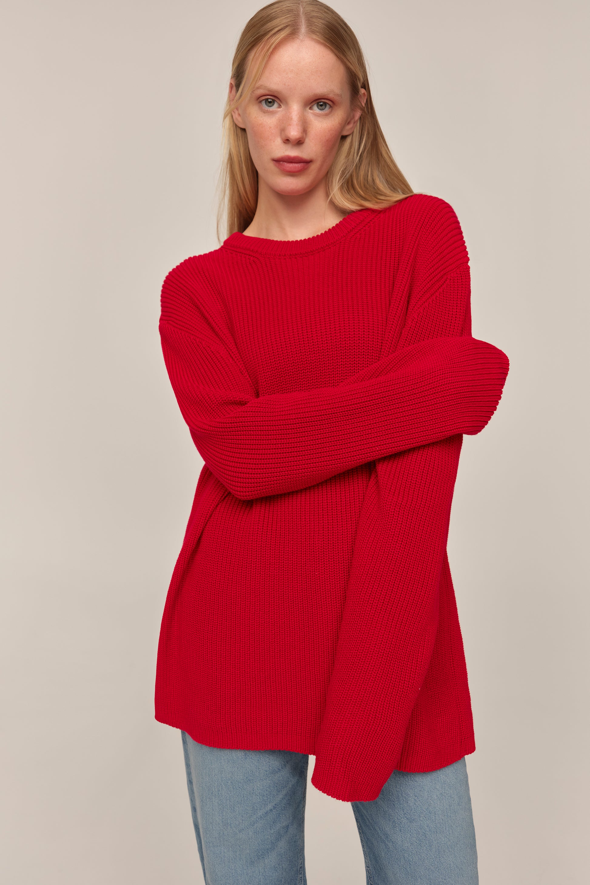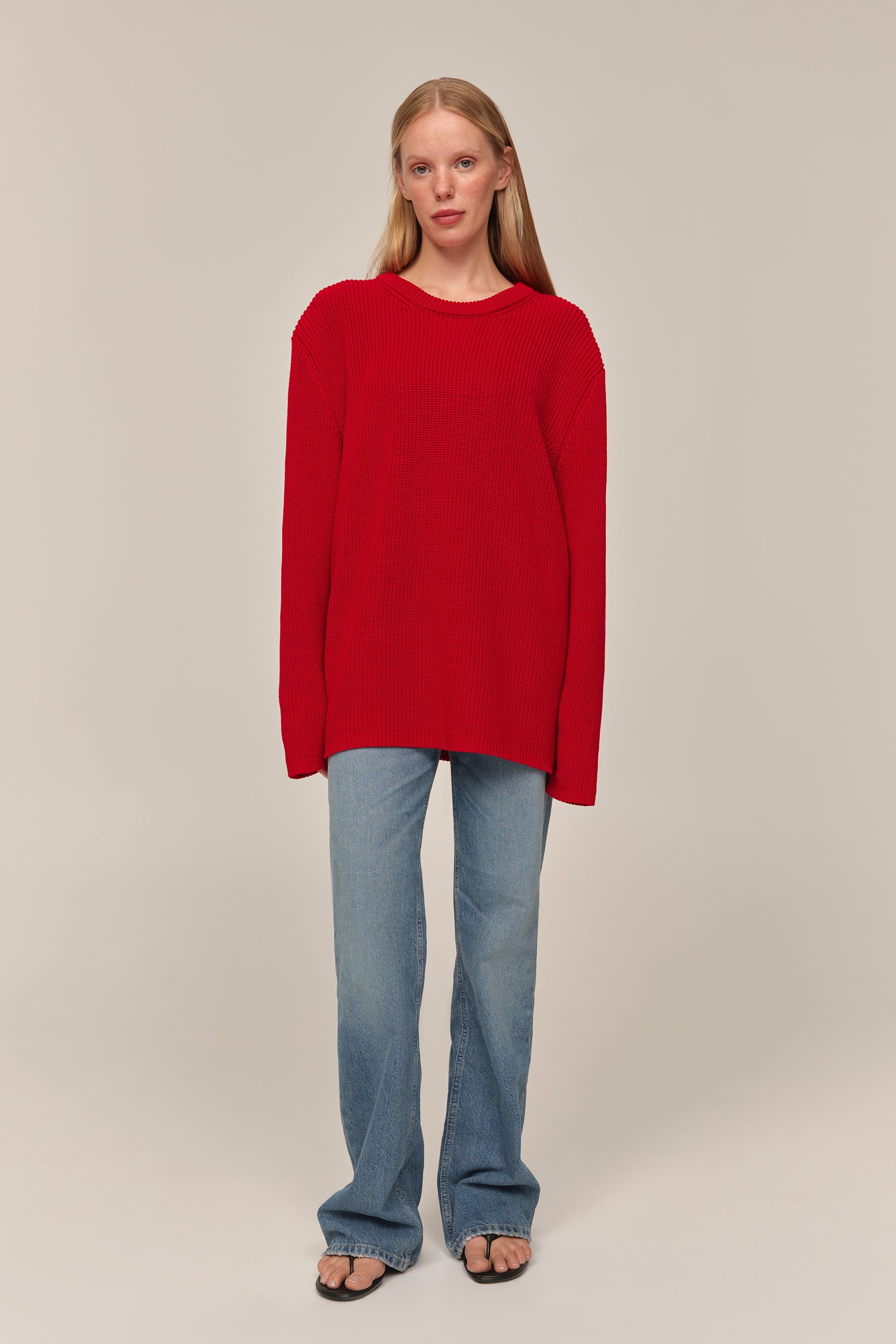 Kaia is a cotton sweater that embodies the honesty of material and the clarity of form. Its volume is emphasized by a structured knit that adds depth to the silhouette, while elongated sleeves bring a sense of ease and relaxation. Designed with a relaxed fit, it can be worn as a standalone piece or layered effortlessly. More than just a basic, it is a sweater that gives structure to a wardrobe — understated, yet defined in its details.