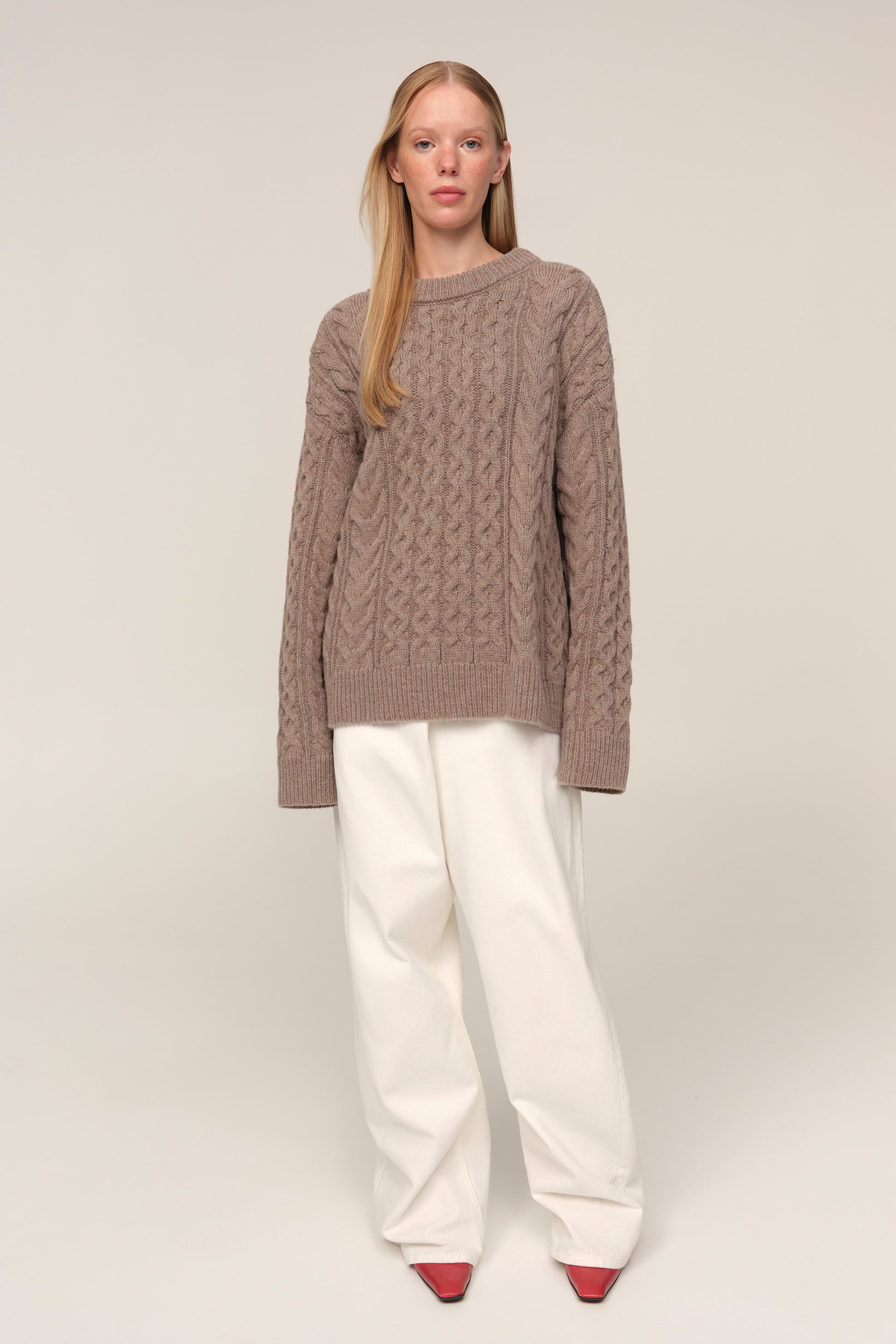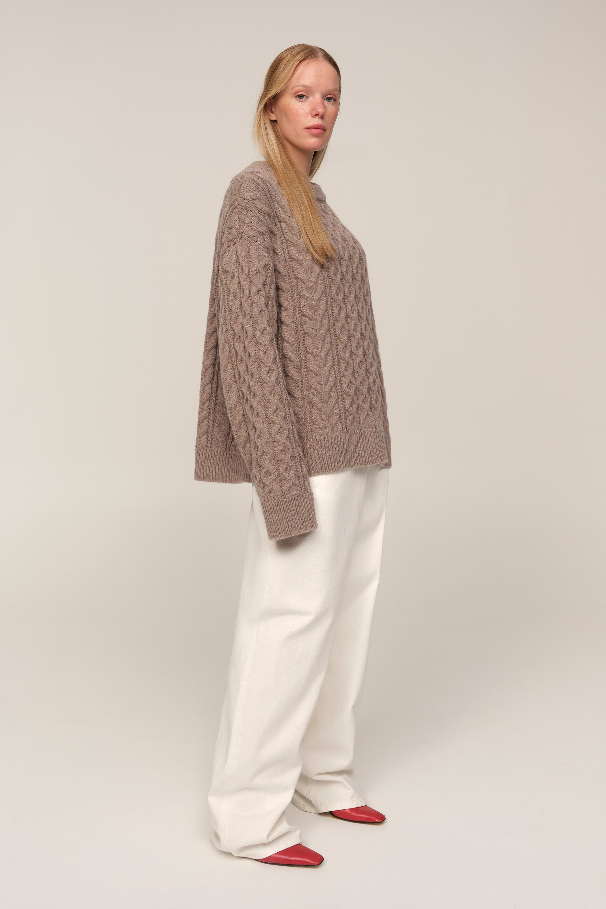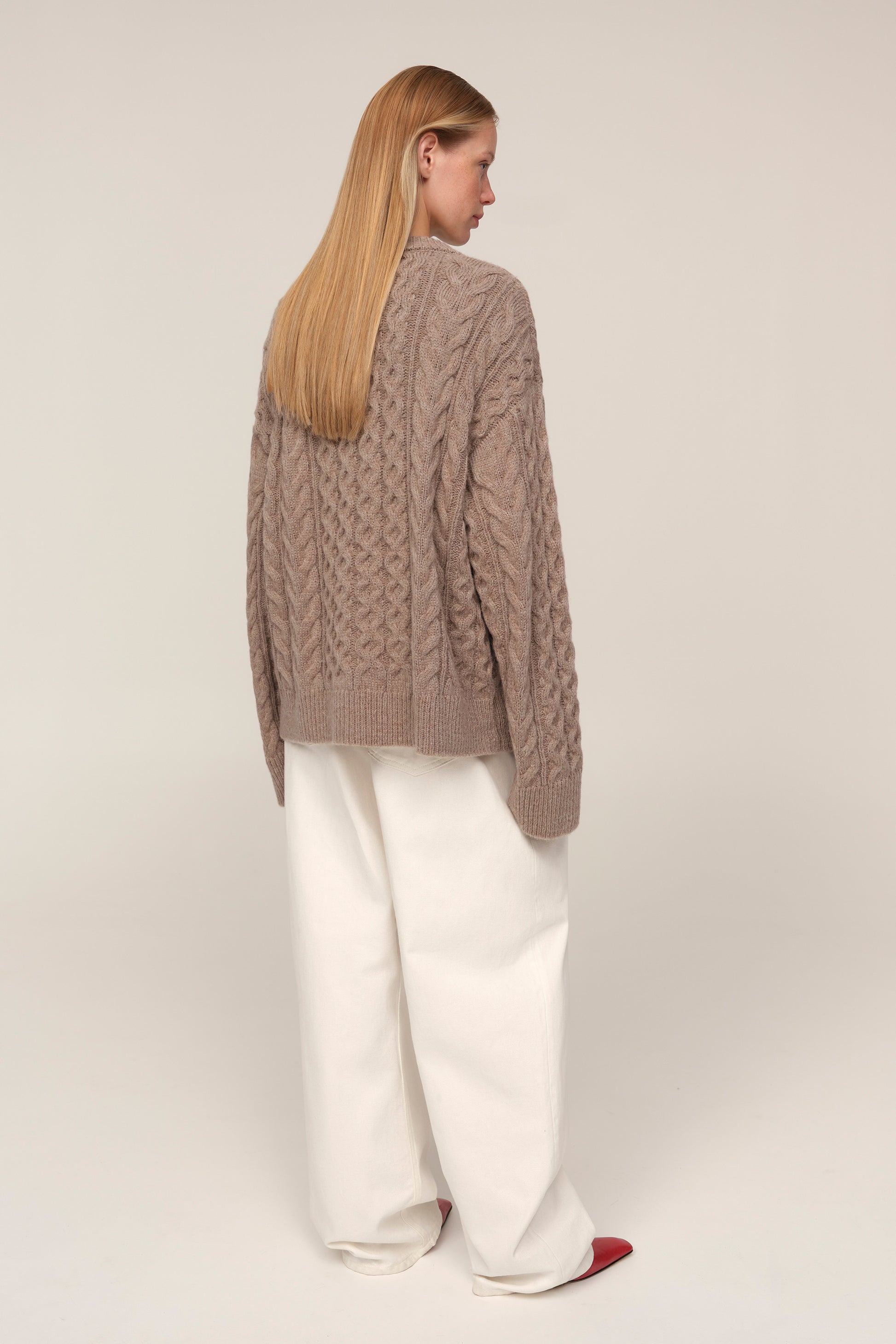 The Avena sweater was designed as a refined expression of comfort. The cable-knit pattern holds a timeless quality, echoing the classical heritage of knitwear while retaining a soft, modern sensibility. With long sleeves and a silhouette marked by volume, it becomes effortless in everyday wear — understated, yet never ordinary. A key piece in any wardrobe, it moves seamlessly from simple pairings to more considered styling.